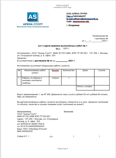- акт приема-передачи, подтверждающий отсутствие претензий на трибуну бличер от принимающей стороны.
