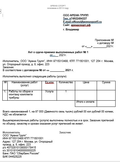 - акт приема-передачи, подтверждающий отсутствие претензий на трибуну разборную от принимающей стороны.